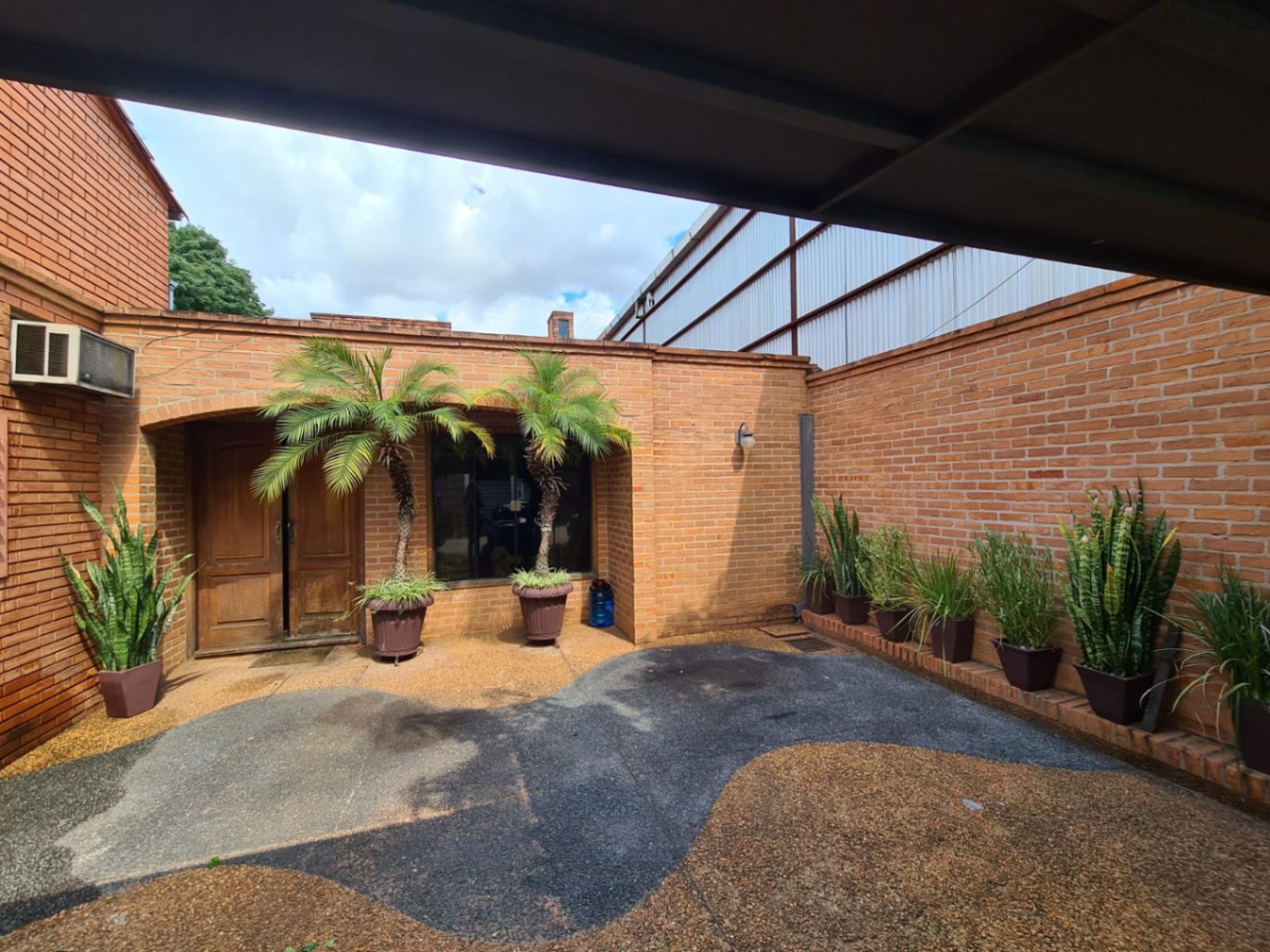 Acceso a garage para 2 vehículos con portón basculante con piso de canto rodado y acceso peatonal.
